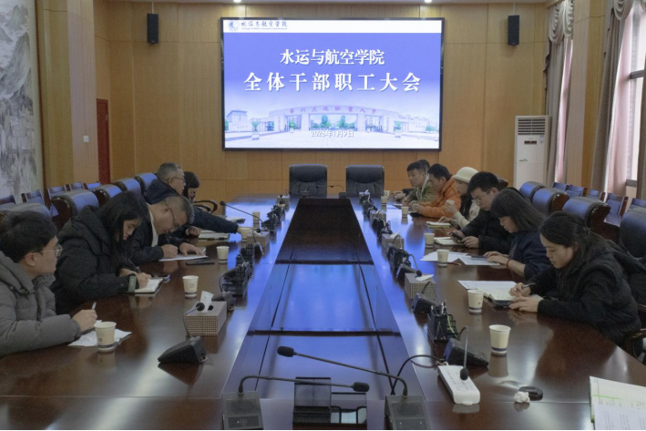 2026年1月9日,水运与航空学院在礼堂209会议室召开2025年秋季学期第五次全体干部职工大会。会议由学院党委书记安军主持,学院全体教师参加。